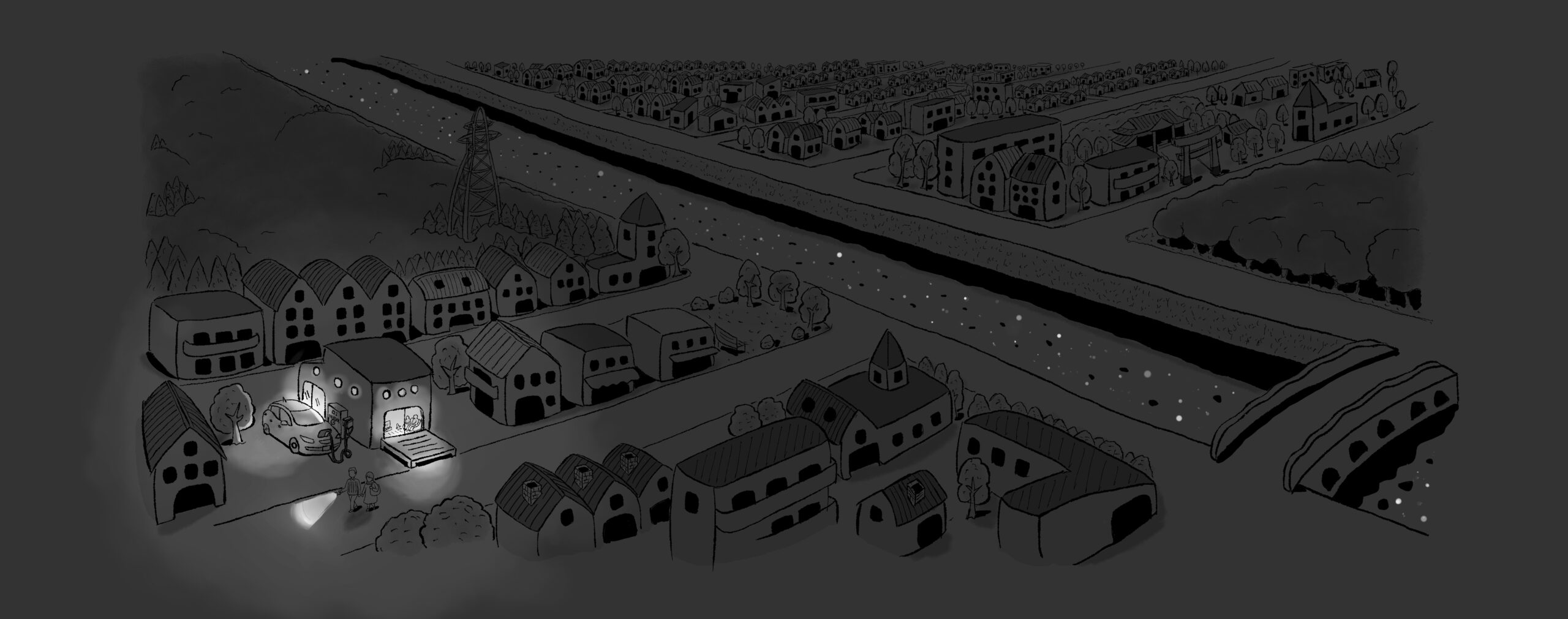 電気自動車のCMイラストマップです。災害や停電時の電気自動車の有益性を表現しました。