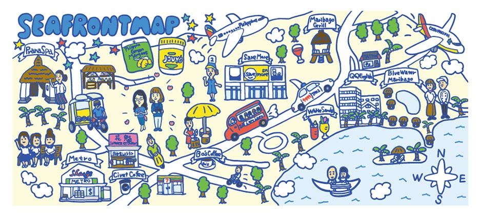セブ島の英会話学校のイラストマップです。ローカルな乗り物だったり、食べ物だったりフィリピンの賑やかでフレンドリーな雰囲気をイラストマップで表現しました。
