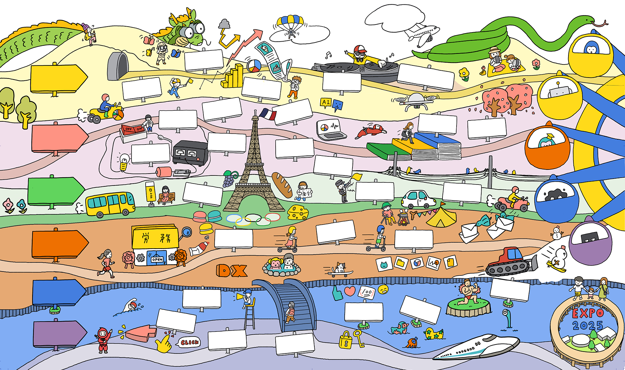 こちらは企業さまの1年間のロードマップイラストです。プロジェクトから連想されるイラストやマイルストーン、その年に起こるイベントを描いたり、クライアントさまと楽しくデイスカッションしながら、アイデアを形にしていきました。それぞれの看板にスペースを空けており、プロジェクトご担当者さまが書き込めるようにしました。