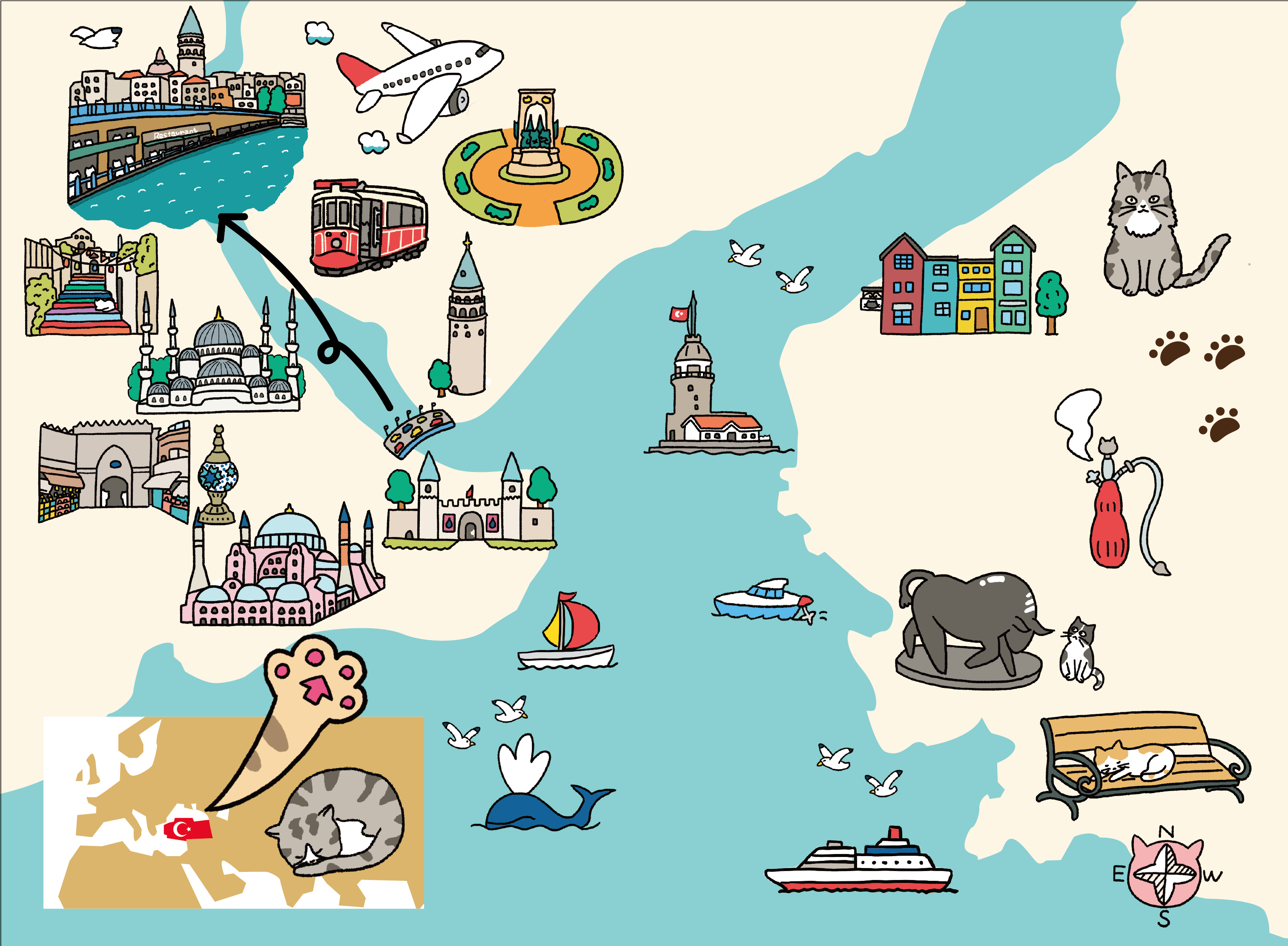書籍用のイラストマップです。トルコのイスタンブールと猫がテーマで、それぞれのランドマークのイラストに猫がいるというアイデアでとても楽しく描かせていただきました。イスタンブール行ってみたいですねぇ。