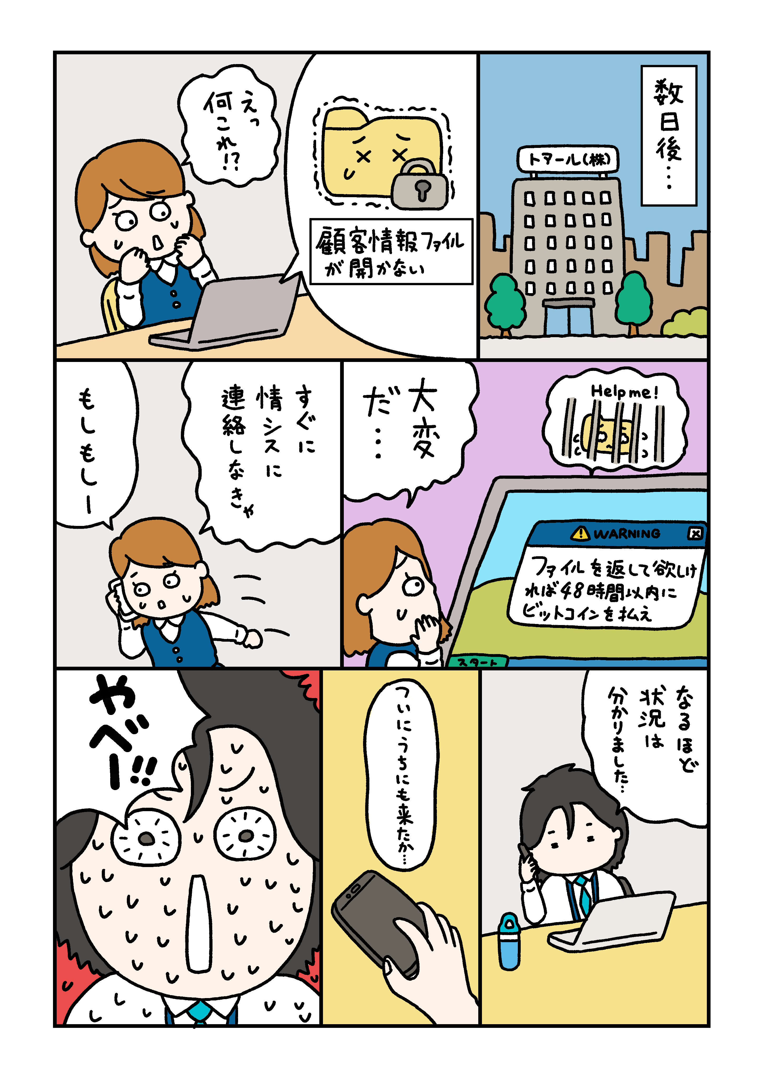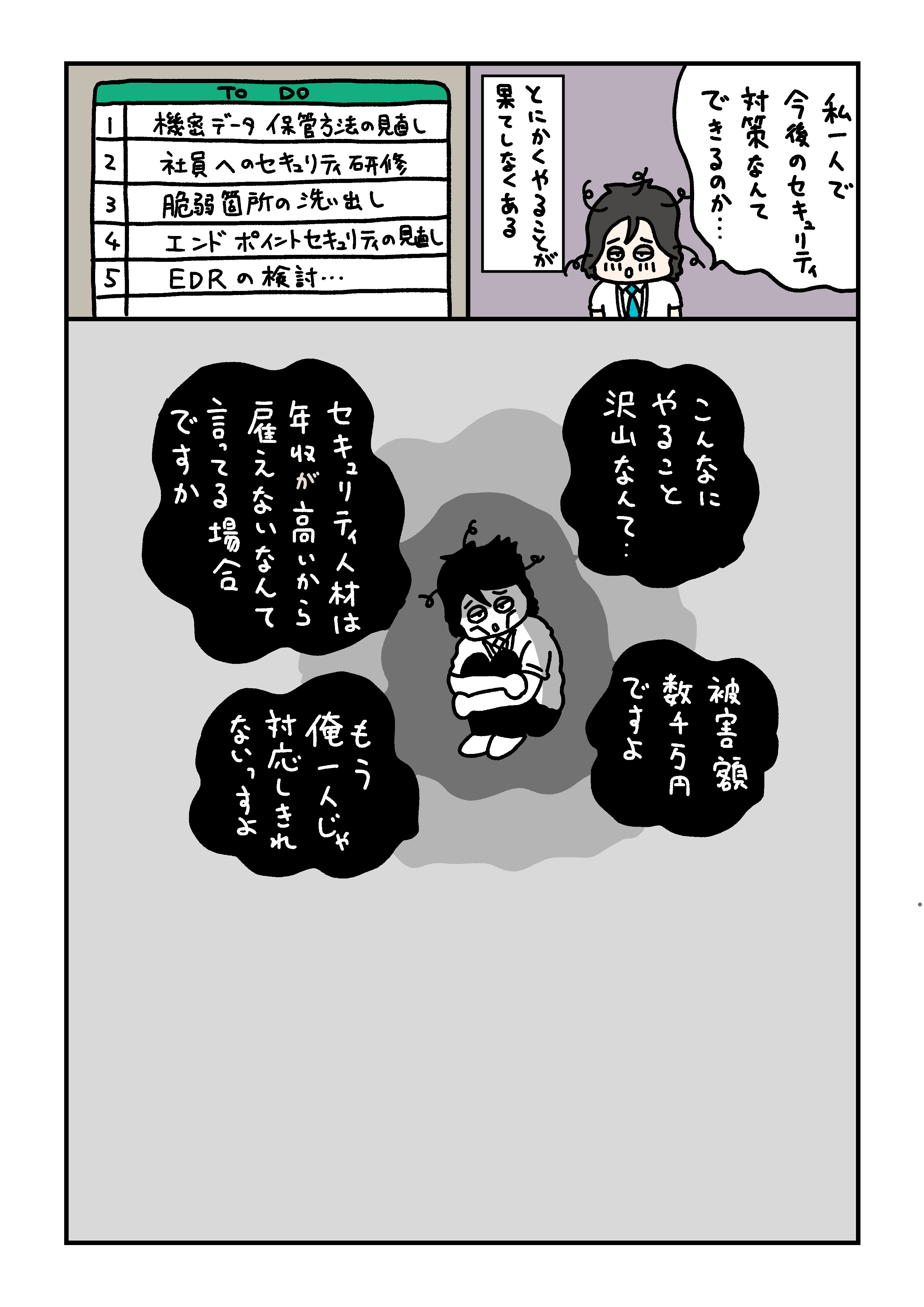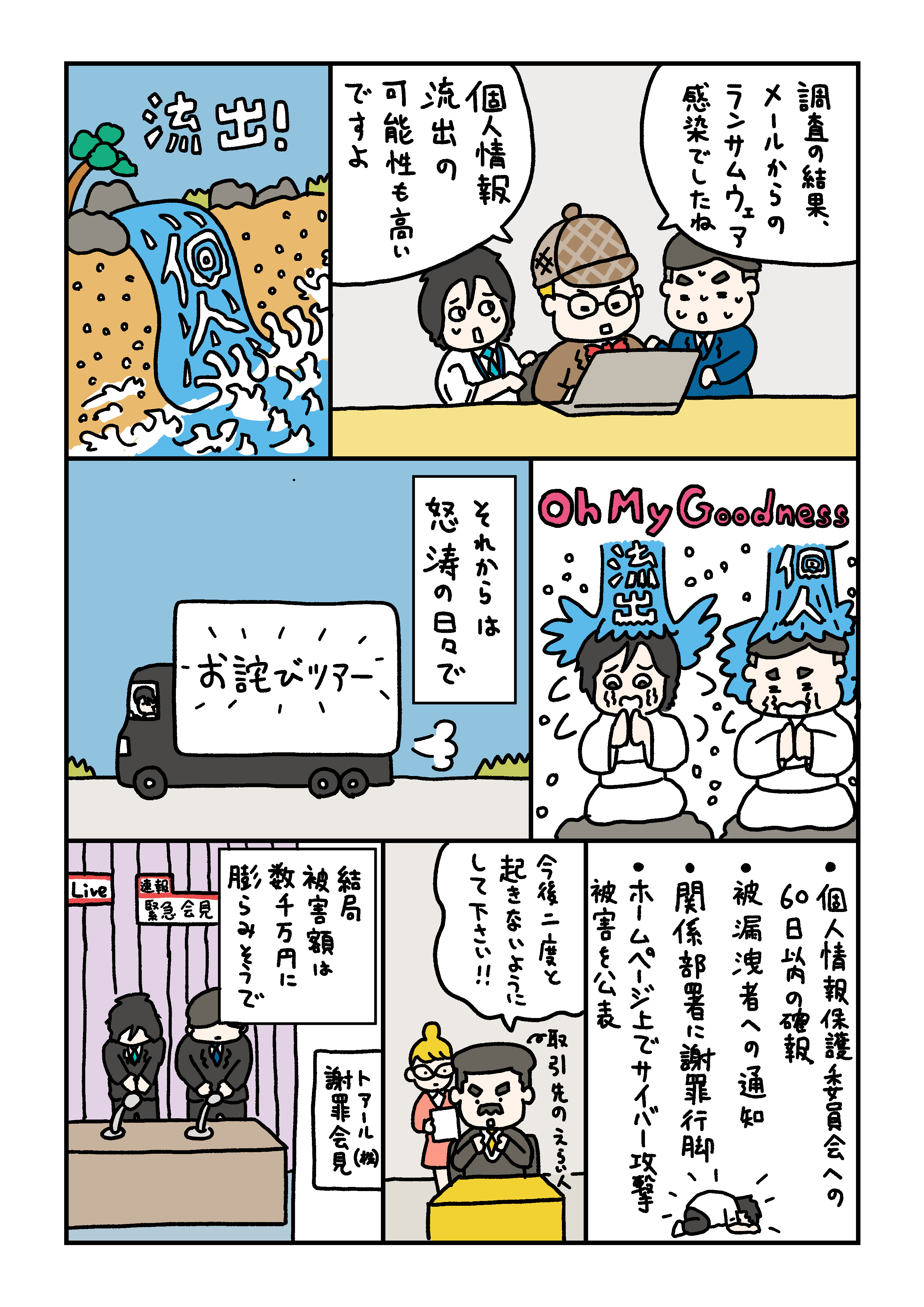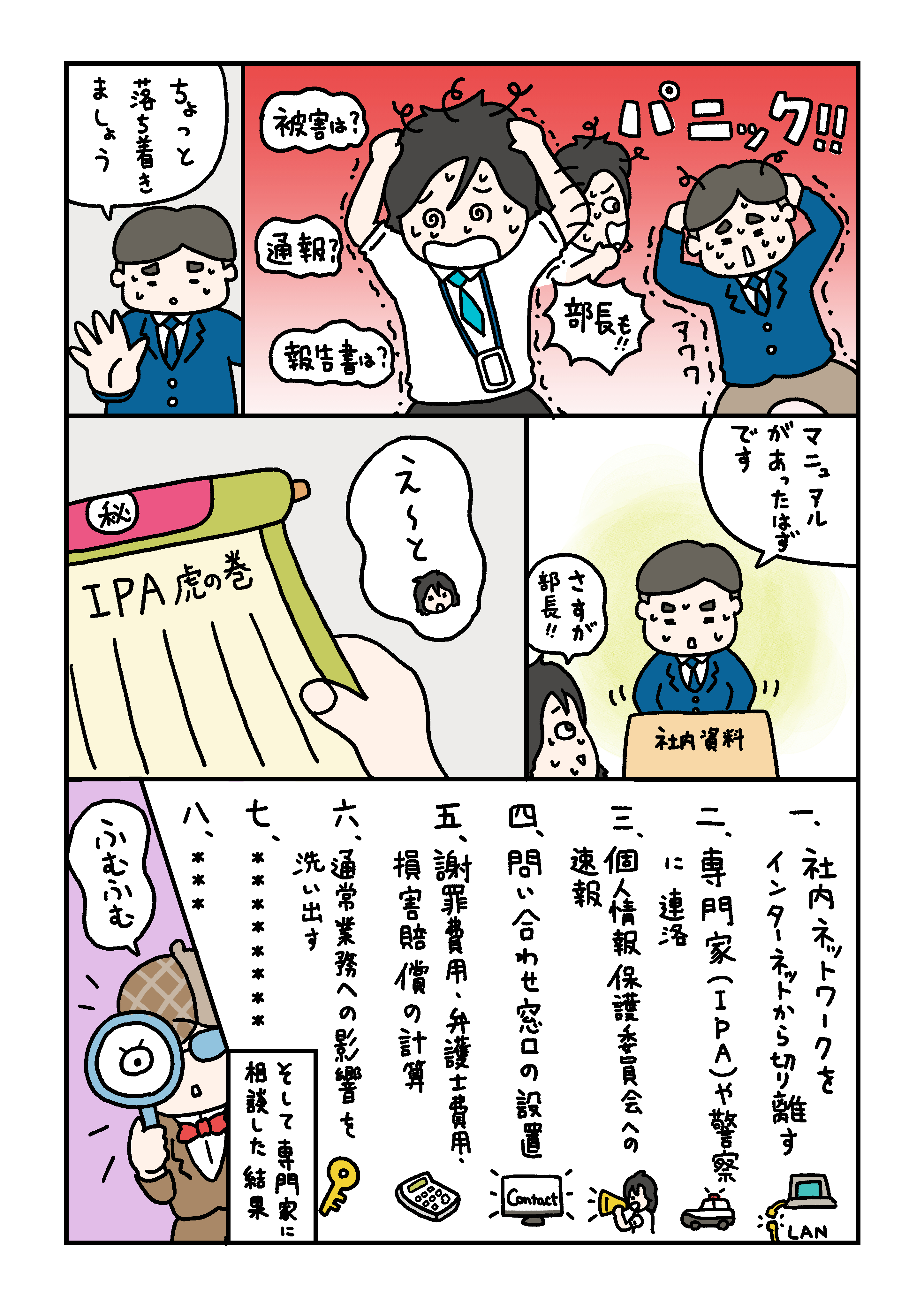 情報セキュリティーに関するマンガを描かせていただきました。とある企業の情シスさんが主人公で、たまにニュースになる個人情報流出などが起きた場合の怖いケースについて、コミカルにでも深刻な事態になる様子を描きました。