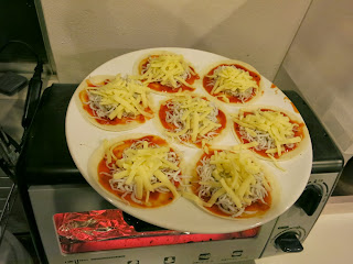 ②餃子の皮にピザソースをぬって、トッピングをのせる。