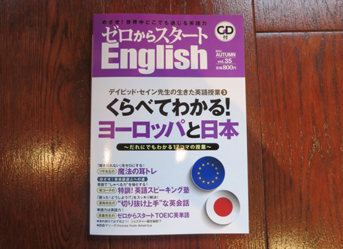 『0からスタートEnglish』は世界で通じる英語力をめざしています。今号のテーマは「くらべてわかる!ヨーロッパと日本」です。シェアハウスにもヨーロッパからくる外国人がたくさんいて、日本と比べて「えっそうなの?!」って驚くことあります。具体的な数字をあげて面白い話題がたくさん入っています。僕は英文に数字が入ると混乱することがよくあるので、テキストに付属のCDでよくリスニングしたいと思います。是非、書店でお手に取ってみてください。