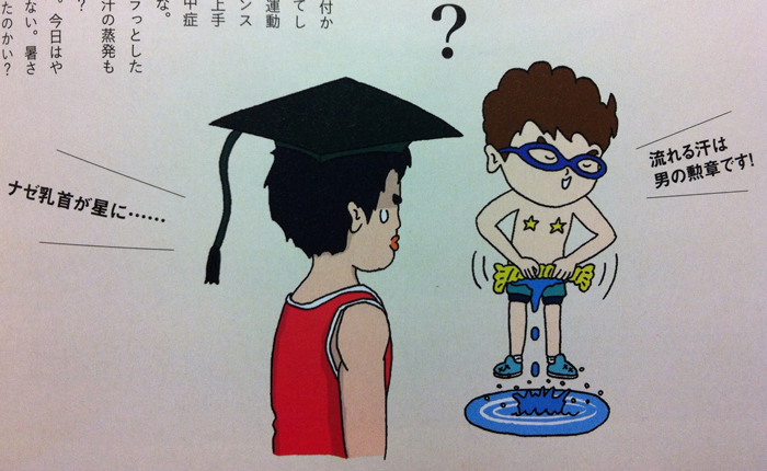 桜井先生は元デカスロン(十種競技)の選手で、文武両道のイメージをキャラクター化しました。タンクトップによく大学の卒業生が被る四角い帽子(学士帽というらしいです)という異様な格好です(笑)