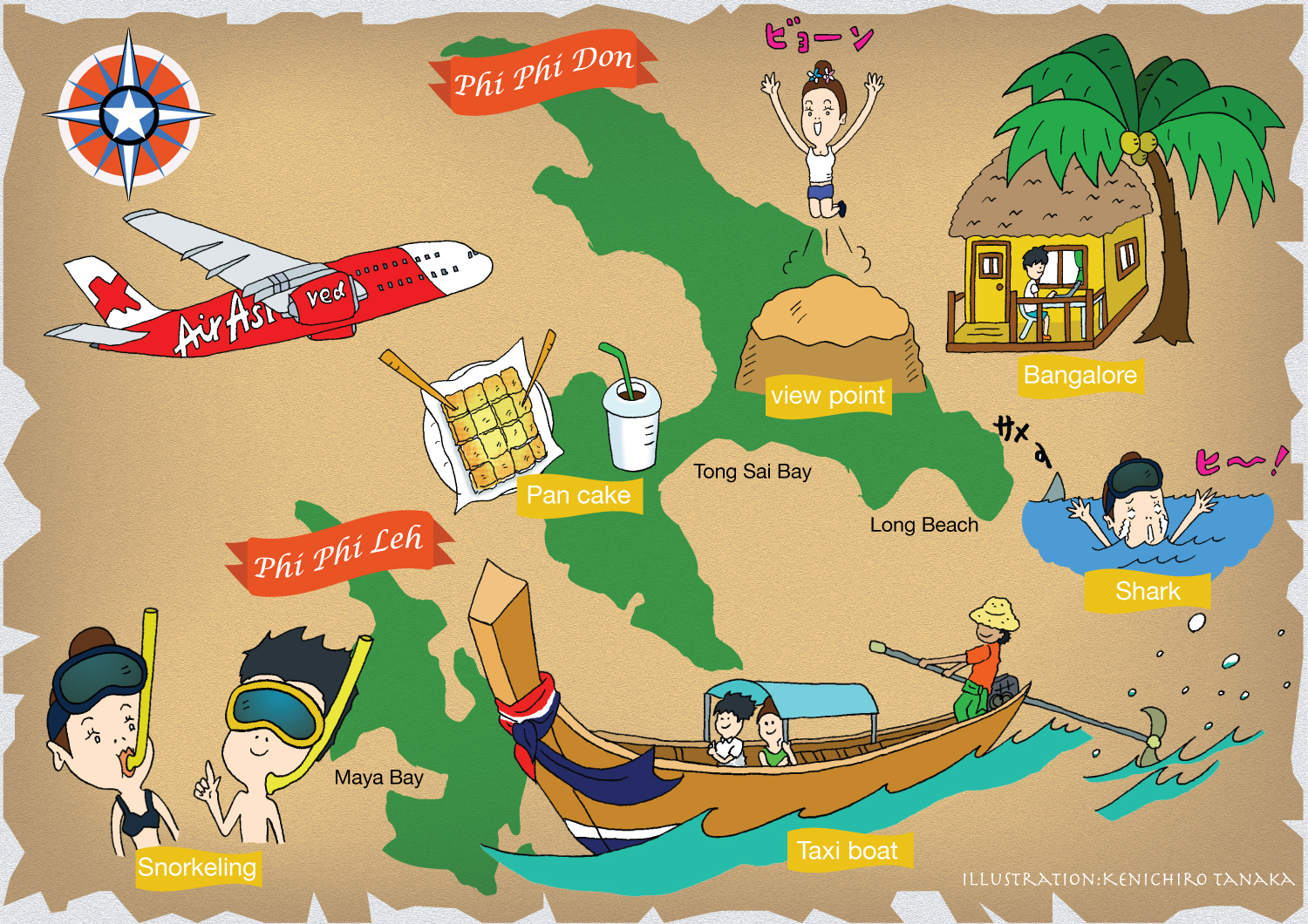 ステフィーさんのテンションがあがります。ピピ島では、タクシーボートが移動の手段でした。まるでバイクに乗っているかのような体感速度がでます。ボートはバックパックを乗せて宿泊先へ走ります。僕らはロングビーチにあるバンガローに滞在しました。